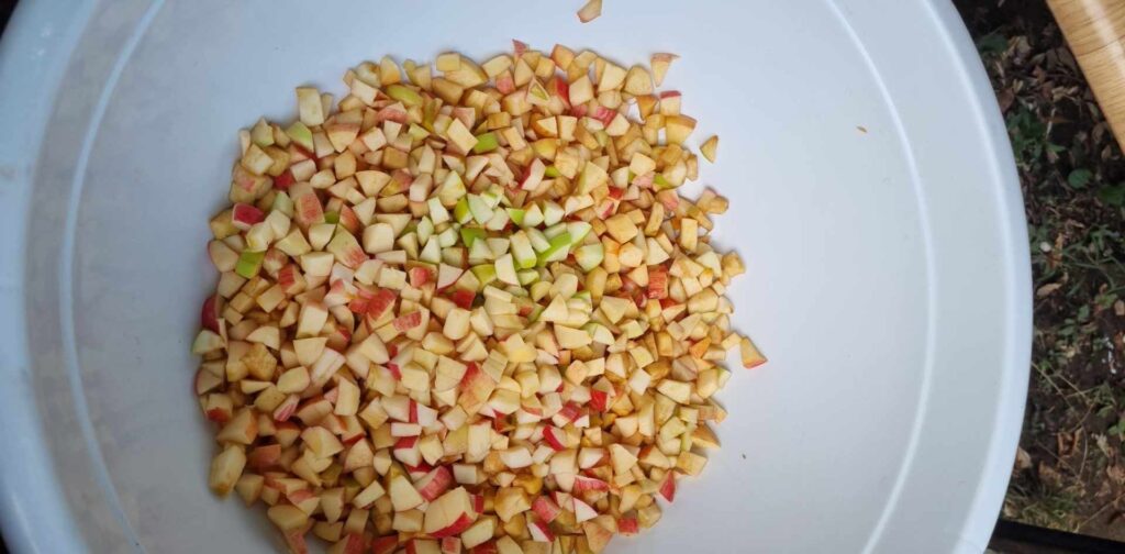 Kendi bahçemde yetişen elmaları toplayıp tozlarından arındırmak için yıkadım ve balkonda 3 gün kadar beklettim. Aslında bir – iki gün yeterliydi ama araya başka işler girince beklemek zorunda kaldılar.. Elmaları güzelce çekirdeklerinden, çürüklerinden ve kurtlarından arındırdıktan sonra tavla zarı büyüklüğünü örnek alarak doğradım. Biraz zamanımı almadı değil, ancak sonuçta sevinmek, süreçte başınızın ağrımaması için bunu yapmalısınız. Ayıklamış olduğum bu meyveleri 8 kilograma tamamladım. Çünkü 4 kavanozum vardı ve her birine 2 kg meyve parçası koymayı planladım. Meyve parçalarımı kavanozlara paylaştırıp kavanozların kapaklarını kapattım. Bu şekilde 48 saat beklediler.
