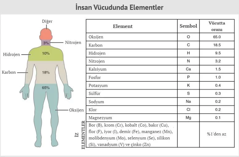 İnsan vücudundaki elementlerin rolü hakkında 100 yıldan daha az bilgi sahibiyiz. İnsanın vücut kütlesinin % 98’inin dokuz metalik olmayan elementten oluştuğu tahmin edilmektedir.